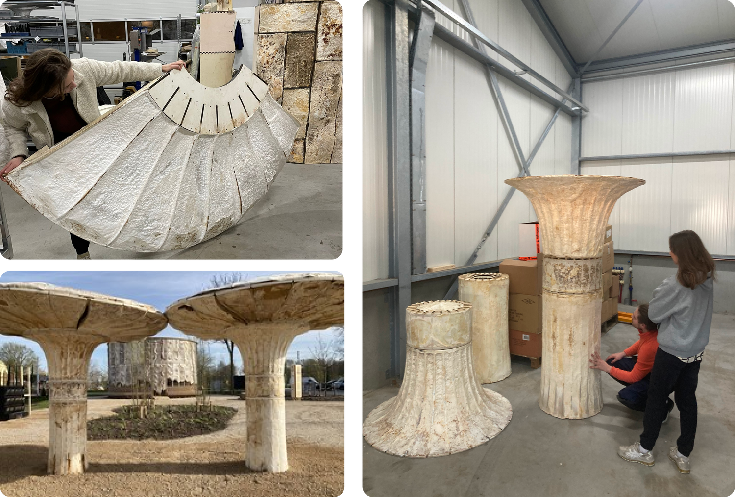 WorldExpo Floriade commisioned us at the SOGN Living Lab in Bleiswijk to develop a biobased bus stop. The biophilic design by Studio Cartier was inspired by mushrooms. The revolutionary and experimental mushrooms of each 3 meters high and wide were constructed with wood, hemp mycelium, and a textile as the skin. The textile decreased the scrapability of the surface, the wood increased the load bearing. Wind load and safety aspects demanded a lot of attention.